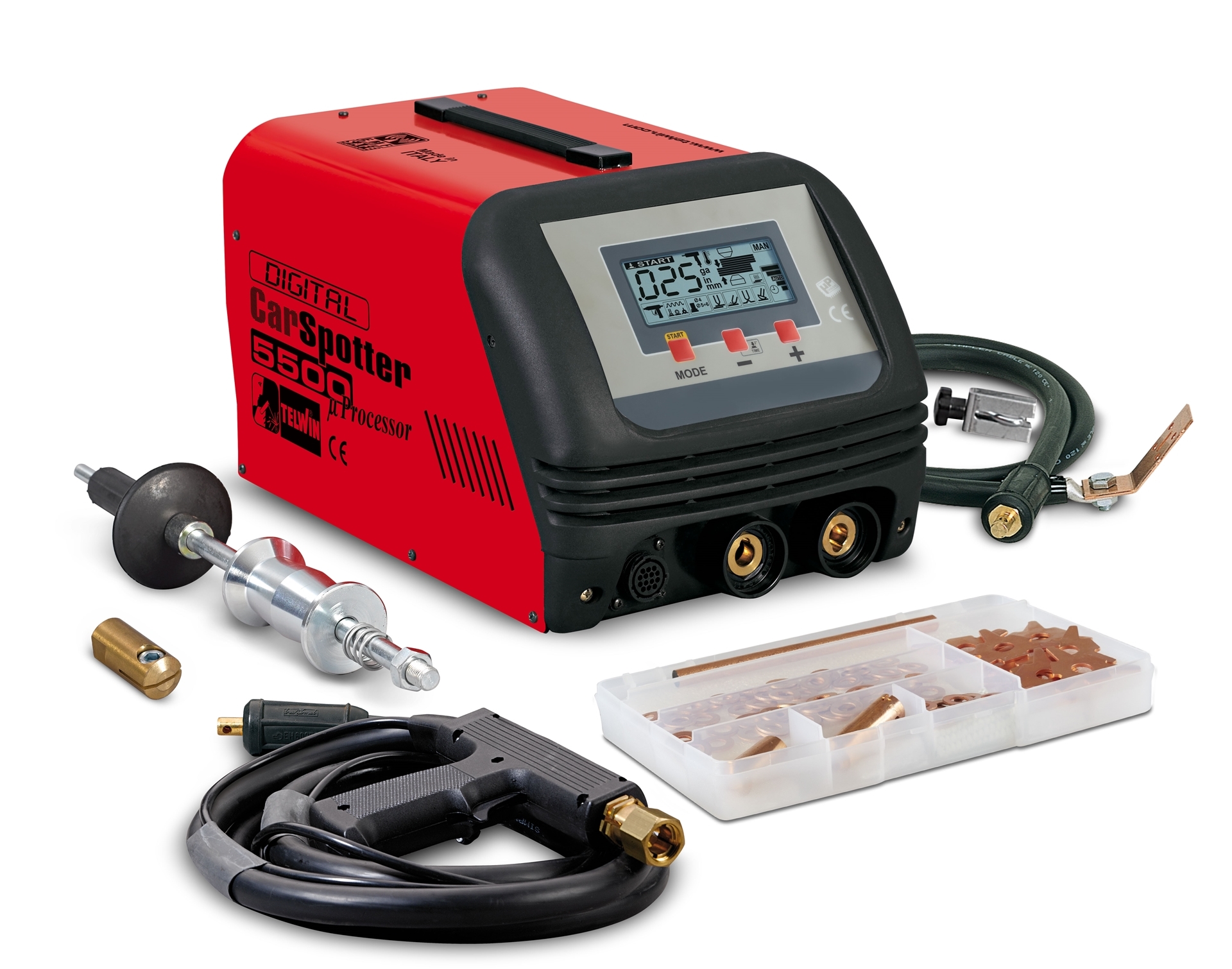 Multifunkční mikroprocesorová bodovací svářečka Telwin Digital Car Spotter 5500.  Pro bodování plechů, nýtů, šroubů, hřebíků, podložek, drátových vlnovců, žíhaní vytahovaných plechů. Volba režimů pro různé bodovací nástroje, volba režimu pro bodování různých tlouštěk plechů, volba režimu žíhání. Napájení 2x 400 V, pro plechy max. 2x1,5 mm