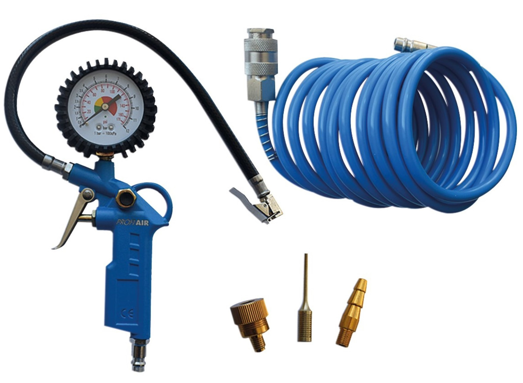 Sada obsahuje:• pistole s manometrem pro huštění pneumatik• 16,5 "spirálová hadice s rychlospojkami• nafukovací tryska pro pneumatiky jízdních kol• nafukovací tryska pro fotbalové míče• foukací / nafukovací tryska pro dinghys• zajistění spojení s frézovanou maticí